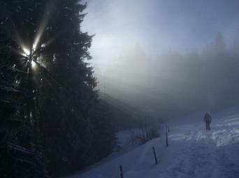 Keywords: winter fog firs sunbeam light snow wanderer snow lane winter hike allgäu