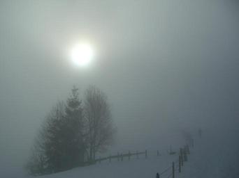 Keywords: winter fog grove of trees snow fence sun pasture fence allgäu