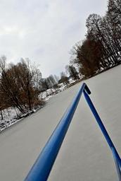 Keywords: winter pond snow frozen surface sky gray water railing