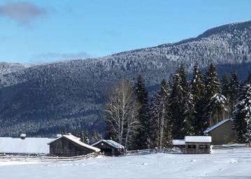 Keywords: winter season cold snow icy landscape scenery fog early morning sunrise canim lake british columbia canada weather nature mood morning glory ranch buildings