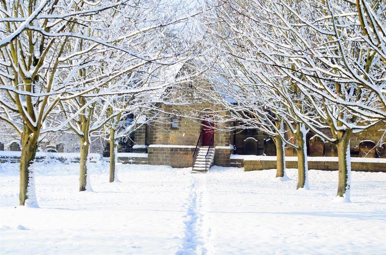Keywords: winter seasons snow snowy tree trees branch branches without leaves cold white nature church building road alley architecture england north yorkshire landscape