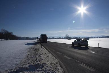 Keywords: winter snow autos traffic road mountains blue haze upper bavaria landscape idyll forest sky sun back light