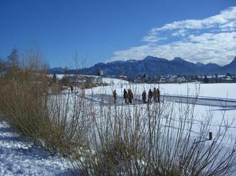Keywords: winter snow lake ice curling ground athletes mountain panorama alpine allgäu ostallgäu white sky blue cloud sunny