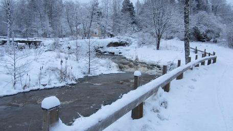 Keywords: winter snow rapids finnish water railing scenic beach river saw concerned siuntio