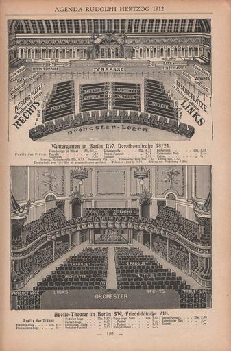 | Keywords: Wintergarten in Berlin NW, Dorotheenstraße 18-21 und Apollo-Theater in Berlin SW, Friedrichstraße 128, Bestuhlung 1912.jpg Rudolph Hertzog Agenda 1912 Jahreskalender des Berliner Kaufhauses Seite 109 Wintergarten in Berlin NW Dorotheenstraße 18-21 und Apollo-Theater in Berlin SW Friedrichstraße 128 Leinen 224 Seiten 19 5 x 28 5 cm Collection Kuhn 1912 publication date author PD-old <gallery> File Wintergarten in Berlin NW Dorotheenstraße 18-21 Bestuhlung 1912 jpg File Apollo-Theater in Berlin SW Friedrichstraße 128 Bestuhlung 1912 jpg </gallery> Rudolph Hertzog Agenda 1912 109 Wintergarten Varieté Apollo-Theater Berlin |