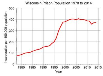 Keywords: Wisconsin Prison Population.svg en Wisconsin prison incarceration rate per 100 000 population from 1978 to 2014 Data from http //www bjs gov/index cfm ty nps BJS 2016-05-11 own Delphi234 other versions current annually Generated with Wikimedia SVG Chart SVG Chart/box cc-zero Prisons in Wisconsin Imprisonment and detention rates in the United States