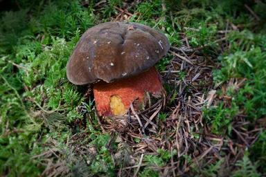Keywords: witches placidus mushroom schusterpilz thunder sponge boletus erythropus hat arched dark brown stalk thick red worm food yellow edible moss green