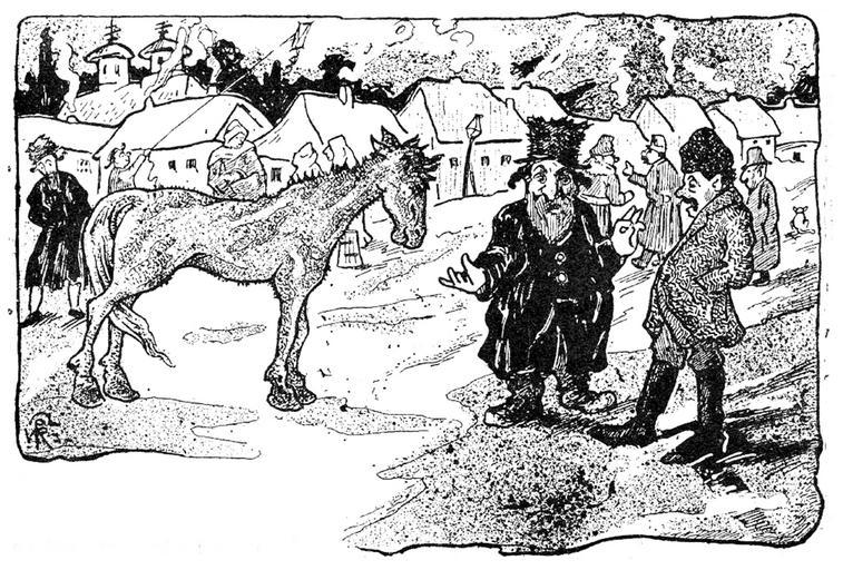 Keywords: Witold Rolla-Piekarski - ÃŽntre negustori de treabă, Furnica, 20 sept 1907.JPG en ÃŽntre negustori de treabă Among Honest Traders cartoon in the Romanian magazine Furnica It portrays ethnic stereotypes in a bargaining situation the traditionalist Jew as a middleman the Romanian as the not entirely honest source of his revenue <br>The Jewish man ” Moi bade Ivane pentru di ce vrei tu să vinzi cală ăsta moi Tu nu vezi că-i mai gras ÅŸi decât tine Ivan my man vy is it dat you should vant to sell dat horse Do you not see eyt is faetter dan you are <br>The Romanian ” Apoi să vezi jupâne Calul ăsta e un cal foarte bun; dar e de furat ÅŸi mi-e frică să nu mi-l fure ÅŸi mie altul Well there you go dear sir This horse is of very good stock but I stole it and I'm afraid that someone else should steal it from me 1907-09-20 Furnica 158/1907 available through the Bucharest City Library http //digitool dc bmms ro 8881/R/3YEN91RDQHN2LLAT98CMIIVH6GP3F19S45D2I6YYIM6AN3KQEN-00734 func search DacoRomanica archive Creator Witold Rolla-Piekarski Custom license marker 2013 02 16 PD-old-auto 1909 Uploaded with UploadWizard Witold Rolla-Piekarski Furnica magazine 1907 cartoons 1907 in Romania Jewish people of Romania Payots Markets in Romania Horses of Romania Horse markets Horse traders