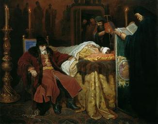 | Keywords: Wjatscheslaw Grigorjewitsch Schwarz 001.jpg Ivan the Terrible near the body of his son whom he murdered Iwan der Schreckliche beim Leichnam seines von ihm erschlagenen Sohnes Ivan le Terrible près du lit de mort du fils qu'il a tué oil canvas cm 71 89 city Moskau country russia Tretyakov Gallery langswitch history Historienmalerei The Yorck Project 10 000 Meisterwerke der Malerei DVD-ROM 2002 ISBN 3936122202 Distributed by DIRECTMEDIA Publishing GmbH 1864 Creator Wjatscheslaw Grigorjewitsch Schwarz http //mail wikipedia org/pipermail/wikide-l/2005-April/012195 html Other versions PD-old-100 PD-Art-YorckProject Realist history paintings 1864 paintings from Russia Ivan IV of Russia in history paintings Schwarz Death in paintings Vyacheslav Schwarz |