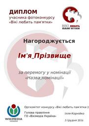 Keywords: WLM UA 2016 Diploma UK.svg uk Диплом учасника Вікі любить пам'ятки в Ук аїні 2016 2016-11-28 own <br /> WLM-logo-uk svg Wikimedia-UA-logo svg 16 Ата other versions cc-zero Wiki Loves Monuments 2016 in Ukraine