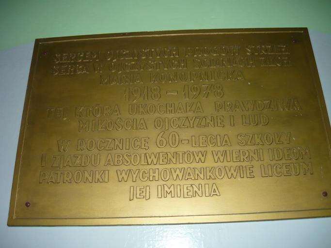 | Keywords: Włocławek-plaque of Maria Konopnicka.JPG en The plaque of Maria Konopnicka in school named of her in Włocławek pl Tablica pamiątkowa na cześć Marii Konopnickiej w szkole nazwanej jej imieniem we Włocławku ru емо иальная доска v pamyat' а ия Конопницкой в школe названа в ее честь в влoцлaвeкe de Gedenktafel von Maria Konopnicka in der Schule nach ihr benannt im Wloclawek own Mariochom 13 sierpnia 2010 Plaques in Włocławek | ||||
