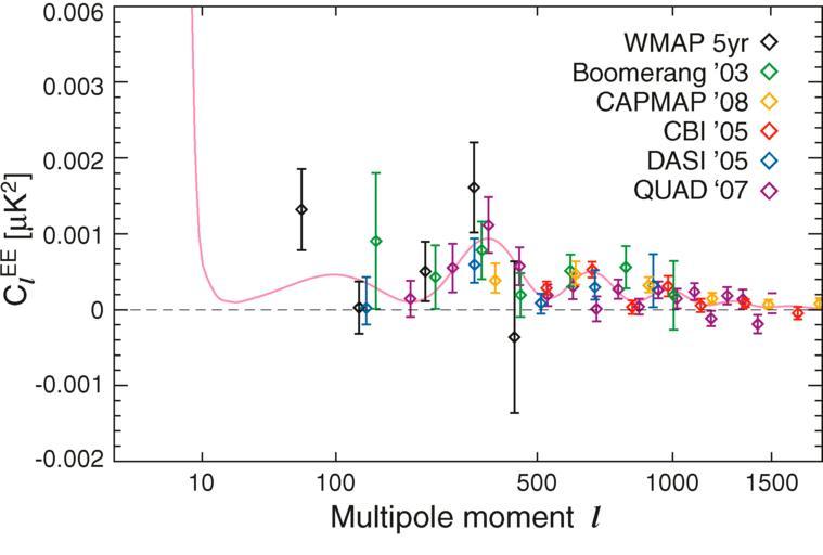 | Keywords: WMAP 5 year CMB Power Spectra.png WMAP 5-year EE power spectrum compared with results from the Boomerang Montroy et al 2006 green CBI Sievers et al 2007 red CAPMAP Bischoff et al 2008 orange QUAD Ade et al 2007 purple and DASI Leitch et al 2005 blue experiments The pink curve is the best-fit theory spectrum from the ΛCDM/WMAP Markov chain Dunkley et al 2008 http //lambda gsfc nasa gov/product/map/pub_papers/fiveyear/power_spectra/wmap_mn5_images cfm 03/18/08 M Nolta et al 2009 ApJS 180 296-305 U S Goveernment http //lambda gsfc nasa gov/product/map/pub_papers/fiveyear/power_spectra/wmap_mn5_images cfm PD-USGov Cosmic microwave background |