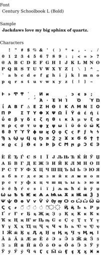 Keywords: Wmfont century schoolbook l bold.svg en Sample rendering of font Century Schoolbook L Bold Own Mktyscn 2009-09-10 Valid SVG Typeface samples Century Schoolbook