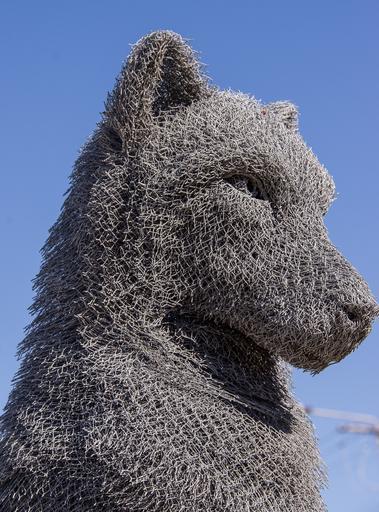 Keywords: wolf sculpture art head face wire metal grey contemporary modern blue sky australia exhibition