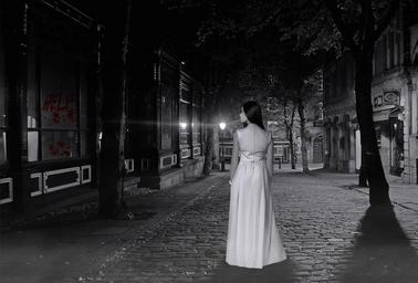 Keywords: woman brunette scary road fear night black and white white dress imagination trees black wallpaper