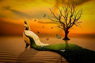 Keywords: woman dune sand tree butterflies grass sunset flowers composing landscape fantasy