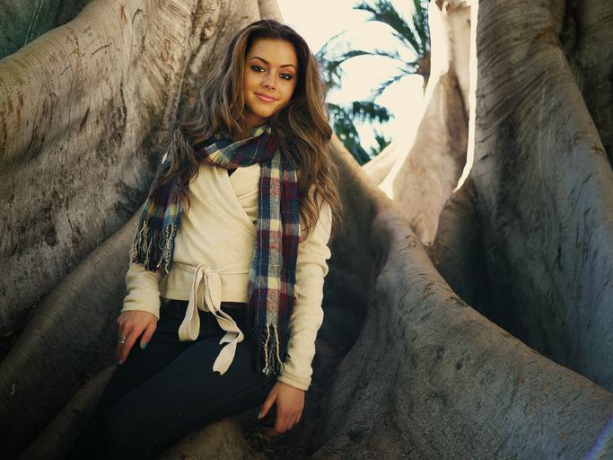 Keywords: woman girl beautiful long wavy brown hair smiling scarf sitting