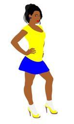 Keywords: woman girl dress short high-heels yellow blue alluring black hair hands hips whore
