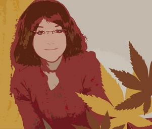 Keywords: woman girl female cutout paper brown red yellow leaves block colour