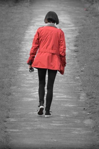 Keywords: woman girl people red jacket pavement way walk