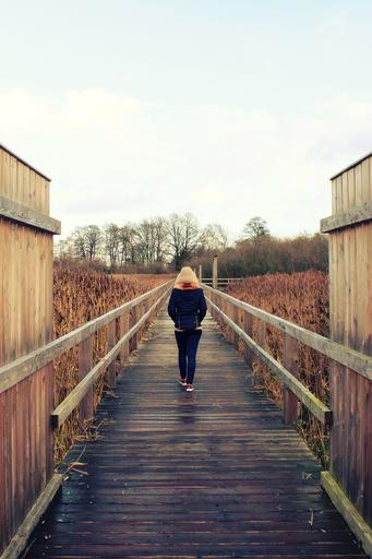 Keywords: woman girl person human mood flip side back rear view move go run walk alone lonely web boardwalk bridge nature thoughtful melancholic trueb autumn rainy cold jacket wind weather reed trees