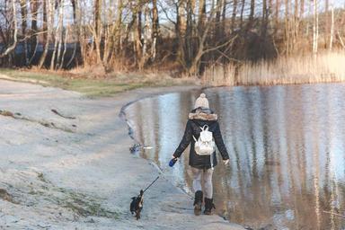 Keywords: woman girl young people person dog pet animal puppy walk walking beach nature winter autumn lake back backpack friend sand sidewalk active lifestyle