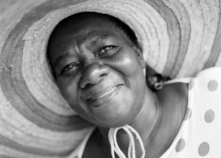 Keywords: woman hat smiling happy black and white portrait macro close-up