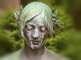 Keywords: woman head portrait sculpture statue antique old copper cemetery weathered mourning face human girl tears