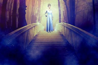 Keywords: woman lady spirit appearance mystical bridge forest fairy tales fantasy ghost spooky dream dress encounter glow lichtspiel darkness temptation pose