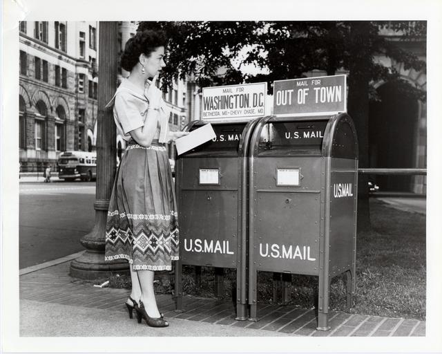 | Keywords: smithsonian institution smithsonianinstitution mailbox usps washingtondc woman letter womensday postal history postalhistory 1960s mail post urban capitol was washington dress national postal museum nationalpostalmuseum mail across the commons mailacrossthecommons blackandwhite black and white Description: This is a Promotional Post Office Department photograph of a woman trying to decide which mailbox to use. During the1960s, the Department was promoting the use of separate mailboxes for local and out of town mail. Creator/Photographer: Unidentified photographer Medium: Black and white photographic print Geography: USA Date: 1960 Collection: U.S. Postal Employees Persistent URL: arago.si.edu/index.asp?con=2&cmd=1&id=194290 Repository: National Postal Museum Accession number: A.2006-38 Description: This is a Promotional Post Office Department photograph of a woman trying to decide which mailbox to use. During the1960s, the Department was promoting the use of separate mailboxes for local and out of town mail. Creator/Photographer: Unidentified photographer Medium: Black and white photographic print Geography: USA Date: 1960 Collection: U.S. Postal Employees Persistent URL: arago.si.edu/index.asp?con=2&cmd=1&id=194290 Repository: National Postal Museum Accession number: A.2006-38 |