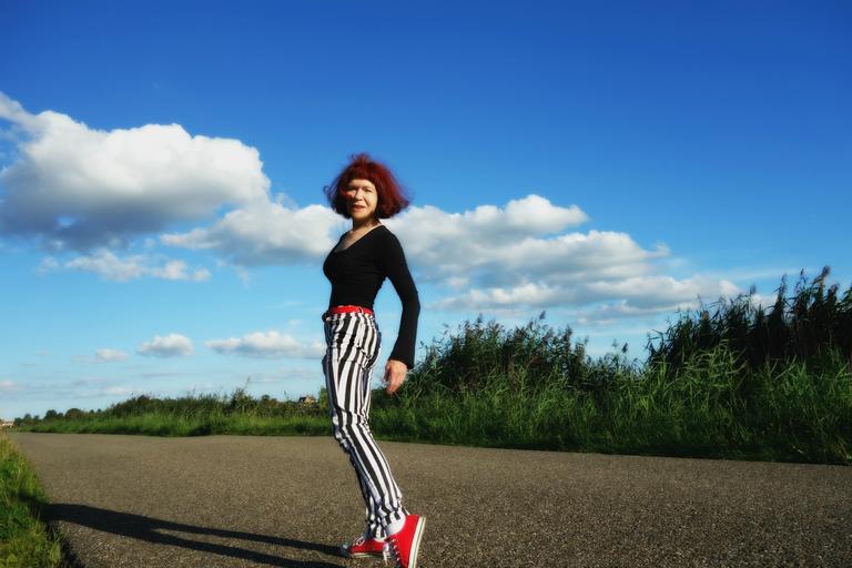 Keywords: woman model fashion pose fashionista fashion model style stripes striped pants cool hip person people road sky clouds