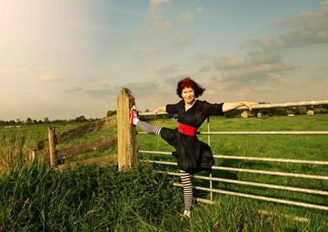Keywords: woman person people model fashion fashion model clothes stripes pantyhose black dress belt red belt pose gate split exercise flexible supple smile happy person