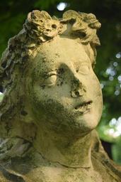 Keywords: woman's head statue stone roof weathered defect error cracks old forget stone figure