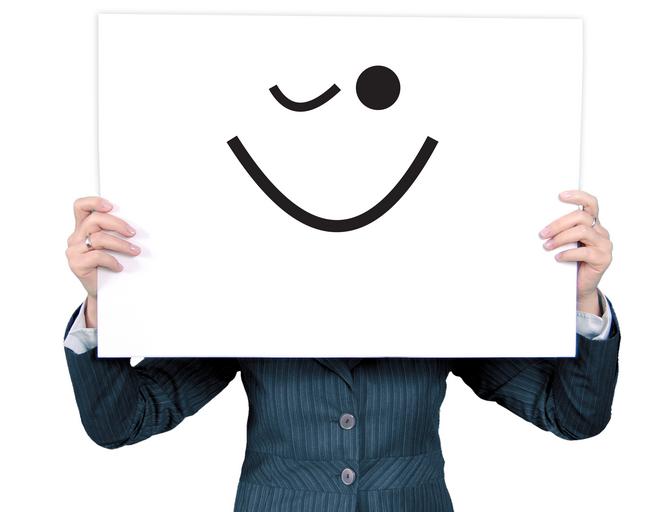 Keywords: woman smiley emoticon wink blinking eyes face hint appearance look impression mask contributed inspect mirage deception bill expression businesswoman information board message contact business cards company business