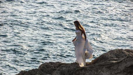 Keywords: woman sunset sea rock sun summer romantic cliff