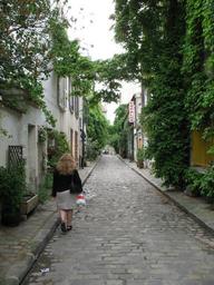 Keywords: woman walking shopping paris france side street cobble stone architecture european romantic tourist old summer