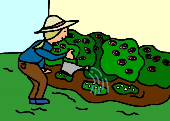 Keywords: woman watering garden spring summer flowers roses cartoon hobby lawn landscape