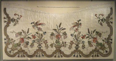 | Keywords: Woman's decorative apron, England, 1700-1750, silk tabby - Patricia Harris Gallery of Textiles & Costume, Royal Ontario Museum - DSC09337.JPG Exhibit in the Patricia Harris Gallery of Textiles Costume Royal Ontario Museum Toronto Ontario Canada This exhibit is old enough so that it is in the public domain and photography was permitted in the museum I took this photograph and release it into the public domain Daderot 2011-11-20 15 39 07 Daderot cc0 cc0 Patricia Harris Gallery of Textiles Costume at the Royal Ontario Museum 18th-century textiles Embroidery of England Aprons Close-ups of woven textiles |