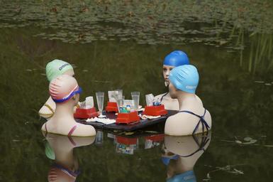 Keywords: women talk gambling group swim swim cap four compared to mirroring reflect mermaids bathing mermaids waters water pond lake art art object modern dolls mannequins communication friendship exchange human interaction chat communicate converse tray table swimmers graceful artwork art project botanical garden of ulm installation people