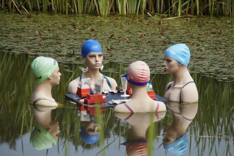 Keywords: women talk gambling group swim swim cap four compared to mirroring reflect mermaids bathing mermaids waters water pond lake art art object modern dolls mannequins communication friendship exchange human interaction chat communicate converse tray table swimmers graceful artwork art project botanical garden of ulm installation people