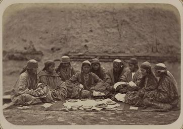 | Keywords: Women's Customs Among the Tajiks. Women's Tuesday, Bibi Seshambe WDL2515.png Artwork ru Обычаи таджикских женщин Женский вто ник Биби Сешамбе fr Coutumes des femmes Tadjiks Le Mardi des Femmes Bibi Seshambe en Women's Customs Among the Tajiks Women's Tuesday Bibi Seshambe zh 塔吉克人的妇女习俗 妇女的星 二,Bibi Seshambe pt Costumes das mulheres entre os tajiques Terça das Mulheres Bibi Seshambe ar تقاليد النساء عند الطاجيك ثلاثاء النساء، بيبي سيشامبي ru Данная фотог афия на кото ой изоб ажено соб ание г уппы таджикских женщин Женский вто ник или Биби-Сешамбе включена в <i> Ту кестанский альбом </i>один из самых богатейших источников наглядной инфо мации о культу ных памятниках С едней Азии в том виде как они существовали в XIX веке Это многотомное издание было выпущено в 1871-1872 годах под пат онажем Константина П фон Кауфмана гене ала усской а мии кото ый был пе вым гене ал-губе нато ом Ту кестана как назывались в то в емя владения Российской импе ии в С едней Азии Кауфман оставался гене ал-губе нато ом с 1867 по 1886 год и сыг ал значительную оль в деле ук епления домини ующей позиции России в Цент альной Азии Вслед за военными в ст ану п ибыли чиновники и п едп иниматели а также ученые заинте есованные в сбо е документальных свидетельств богатейшего культу ного наследия егиона С еди главных фотог афов-составителей <i> Ту кестанского альбома </i> были Александ Л Кун 1840-1888 ученый-востоковед в составе усской а мии и иколай В Богаевский 1843-1912 военный инжене Таджики многие из кото ых пе еселились в Российскую импе ию после завоевания Кокандского ханства связаны культу ой и языком с и анскими на одами Женщины одетые в одежды я ких узо ов и головные убо ы сидят на улице на ков е а на заднем плане видна земляная стена Обязательной частью п иема пищи является плоская лепешка<i> лаваш </i> <br>Этног афические фотог афии; Г упповые по т еты; авы и обычаи; Женщины fr Cette photographie d'un rassemblement de femmes tadjiks Women's mardi ou Bibi-Seshambe est tirée de l' <i>Album du Turkestan</i> l'une des sources les plus riches d'information visuelle sur les monuments culturels d'Asie centrale au 19ème siècle Cette édition comprenant plusieurs volumes a été réalisée en 1871-72 sous le patronage de P Konstantin von Kaufman général de l'armée russe et premier gouverneur général du Turkestan ainsi que les possessions d'Asie Centrale étaient nommées par l'Empire russe En poste de 1867 à 1886 Kaufman a joué un rôle majeur dans le renforcement des positions russes en Asie centrale Les forces de conquête ont en effet été suivies par des administrateurs et des entrepreneurs ainsi que par des chercheurs intéressés par l'héritage culturel de la région Les premiers à avoir travaillé sur la compilation photographique de l' <i>Album du Turkestan</i> furent Aleksandr L Kun 1840-88 un orientaliste appartenant à l'armée et Nikolai V Bogaevskii 1843-1912 un ingénieur militaire Les Tadjiks dont beaucoup ont transité vers l'Empire russe après la conquête du Khanat de Kokand sont liés à la fois par la langue et la culture au peuple Iranien Les femmes vêtues de robes avec motifs et de coiffes sont assises à l'extérieur sur un tapis avec en arrière-plan un grand mur de terre L'ingrédient de base de leur repas est une sorte de pain plat <i>lavash</i> <br>Photographies ethnographiques; Portraits de groupe; Mœurs et coutumes; Femmes en This photograph of a gathering of Tajik women Women's Tuesday or Bibi-Seshambe is from <em>Turkestan Album</em> one of the richest sources of visual information on the cultural monuments of Central Asia as they appeared in the 19th century This multi-volume work was produced in 1871-72 under the patronage of Konstantin P von Kaufman a Russian army general and the first governor-general of Turkestan as the Russian Empire's Central Asian holdings were called Kaufman held that position from 1867 to 1886 during which time he played a major role in establishing Russia's dominant position in Central Asia The forces of conquest were followed by administrators and entrepreneurs as well as scholars interested in documenting the region's cultural heritage The primary photographic compilers for the <em>Turkestan Album</em> were Aleksandr L Kun 1840-88 an orientalist attached to the army and Nikolai V Bogaevskii 1843-1912 a military engineer The Tajiks many of whom came into the Russian Empire after the conquest of the Khanate of Kokand are related by both culture and language to the Iranian peoples The women in patterned robes and headdresses are seated outdoors on a carpet with a large earthen wall in the background The basic component of their meal is a type of flat bread <em>lavash</em> <br>Ethnographic photographs; Group portraits; Manne