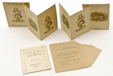 | Keywords: Wonderland Postage-Stamp Case.jpg en The Wonderland Postage-Stamp Case Dodgson Charles Lutwidge Lewis Carroll The Wonderland Postage-Stamp Case Eight or Nine Words About Letter-Writing printed card holder stamp case and pamphlet in a printed envelope torn and creased 118 x 93mm smaller Crutch 193 194 195 Oxford 1890; and a duplicate of card holder and stamp case 6 pieces ru Де жатель ма ок Ст ана чудес Де жатель был издан в виде сдвоенной отк ытки вместе с конве том в кото ый он вкладывался а также с памфлетом Льюиса Кэ олла «Восемь или девять муд ых слов о том как писать письма» 1890 и общим конве том для всего набо а Де жатель и его конве т п илагались в двойном экземпля е http //www liveauctioneers com/item/9361974 liveauctioneers com Creator Lewis Carroll 1890 75px PD-old-100 Stamp albums Alice in Wonderland |