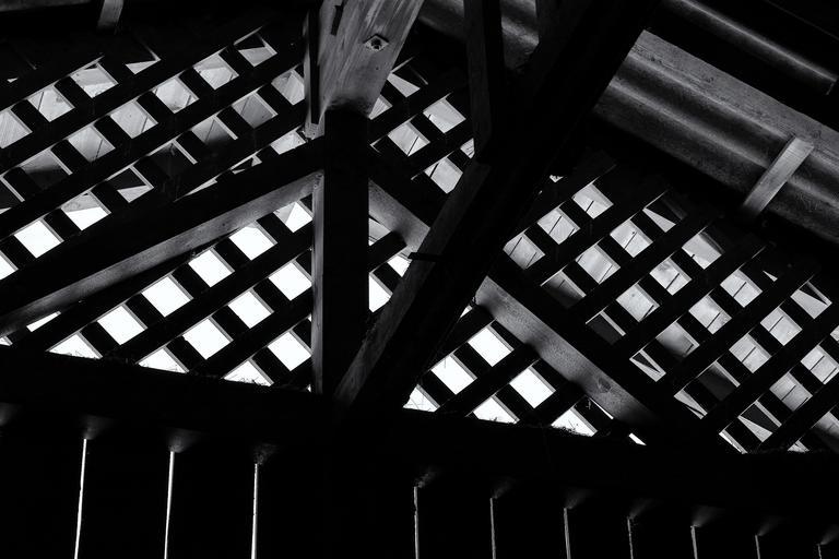 Keywords: wood lattice attic dachgibel wooden beams hay loft black and white recording