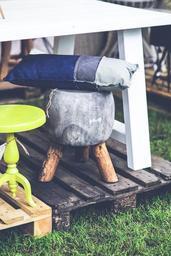 Keywords: wood wooden stool grey pillow table lime green garden sitting