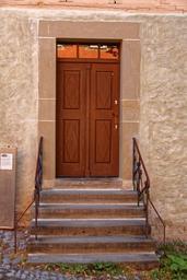 Keywords: wooden door door old wood input house entrance front door home access stairs gradually railing handrail building wrought iron ornament historically sand-lime brick sand stone stone