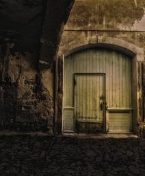 Keywords: wooden door old door front door paved street night dark worrying medieval village