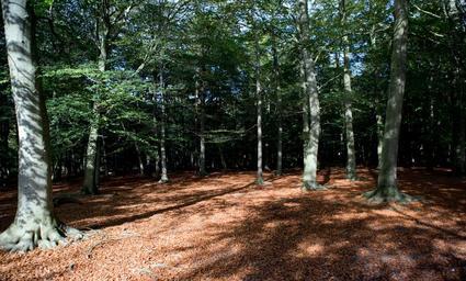 Keywords: woodland forest autumn light sunshine shadows trees foliage green leaf litter brown outdoor landscape