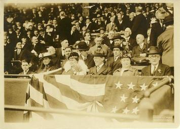 | Keywords: edith bolling galt edithbollinggalt president wilson baseball game yankees senators monochrome Local Accession Number: 981 Description: President Woodrow Wilson and wife Edith watch the season opener of the Washington Senators on April 20, 1916. Wilson threw out the opening ball and the Senators defeated the Yankees 12-4. Photographer: Harris and Ewing Source: Unknown Size: 5x7 Medium: Print, Sepia Date: 04-20-1916 Local Accession Number: 981 Description: President Woodrow Wilson and wife Edith watch the season opener of the Washington Senators on April 20, 1916. Wilson threw out the opening ball and the Senators defeated the Yankees 12-4. Photographer: Harris and Ewing Source: Unknown Size: 5x7 Medium: Print, Sepia Date: 04-20-1916 |