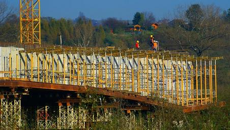 Keywords: work working people execution bridge the design of the support brackets metal cranes the pillars of the crossing fence bay hanging steel frame project building workers yellow