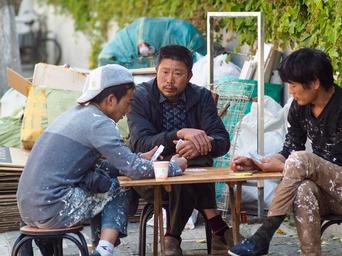 Keywords: workers lijiang men job construction workers paint lunch time play cards rest